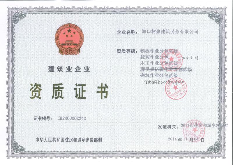 ??跇淙ㄖ趧沼邢薰境闪⒂?011年,公司位于海口,其前身是一家專業建筑施工隊,自2004年即開始在海南從事建筑勞務施工。自成立至今,公司已經擁有一支科學管理、質量過硬、能打硬仗,搶工期的專業隊伍。能獨立承擔大中型工業與民用建筑 、室內外裝修、各類機電設備安裝工程。代表工程有海口濱海華庭、三亞時代海岸T01/02/04/05棟高層、合肥東?;▓@二期、陵水富力灣B區高層、三亞金中海(酒店)、瓊海大印經典花園、??诃h球海景大酒店(四星級酒店,在建中)、陵水珍珠大廈(五星酒店)、??谌f達廣場、美蘭機場二期。